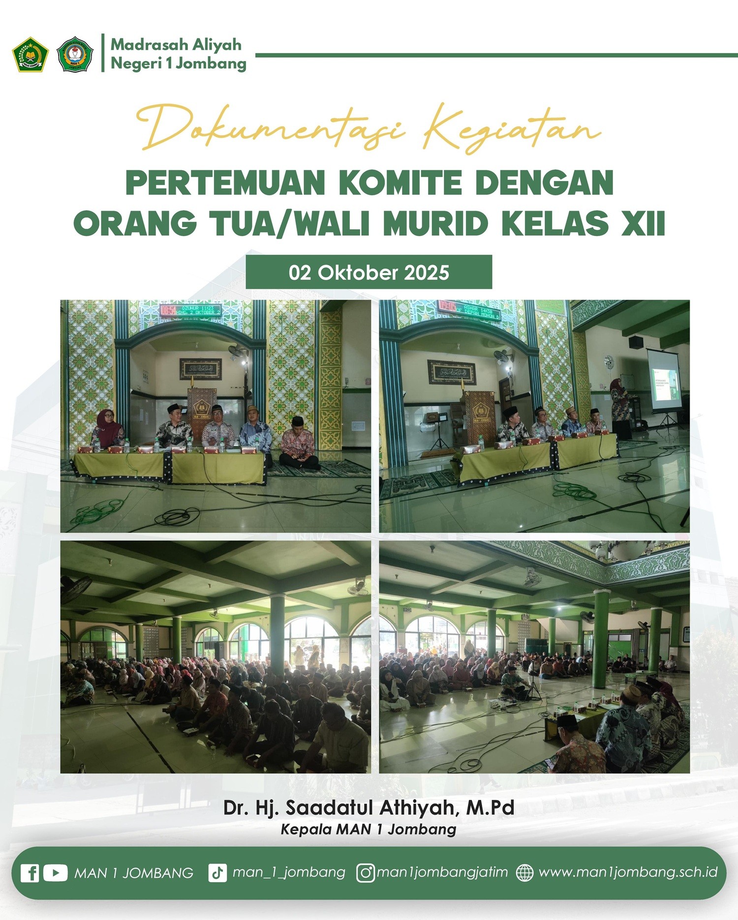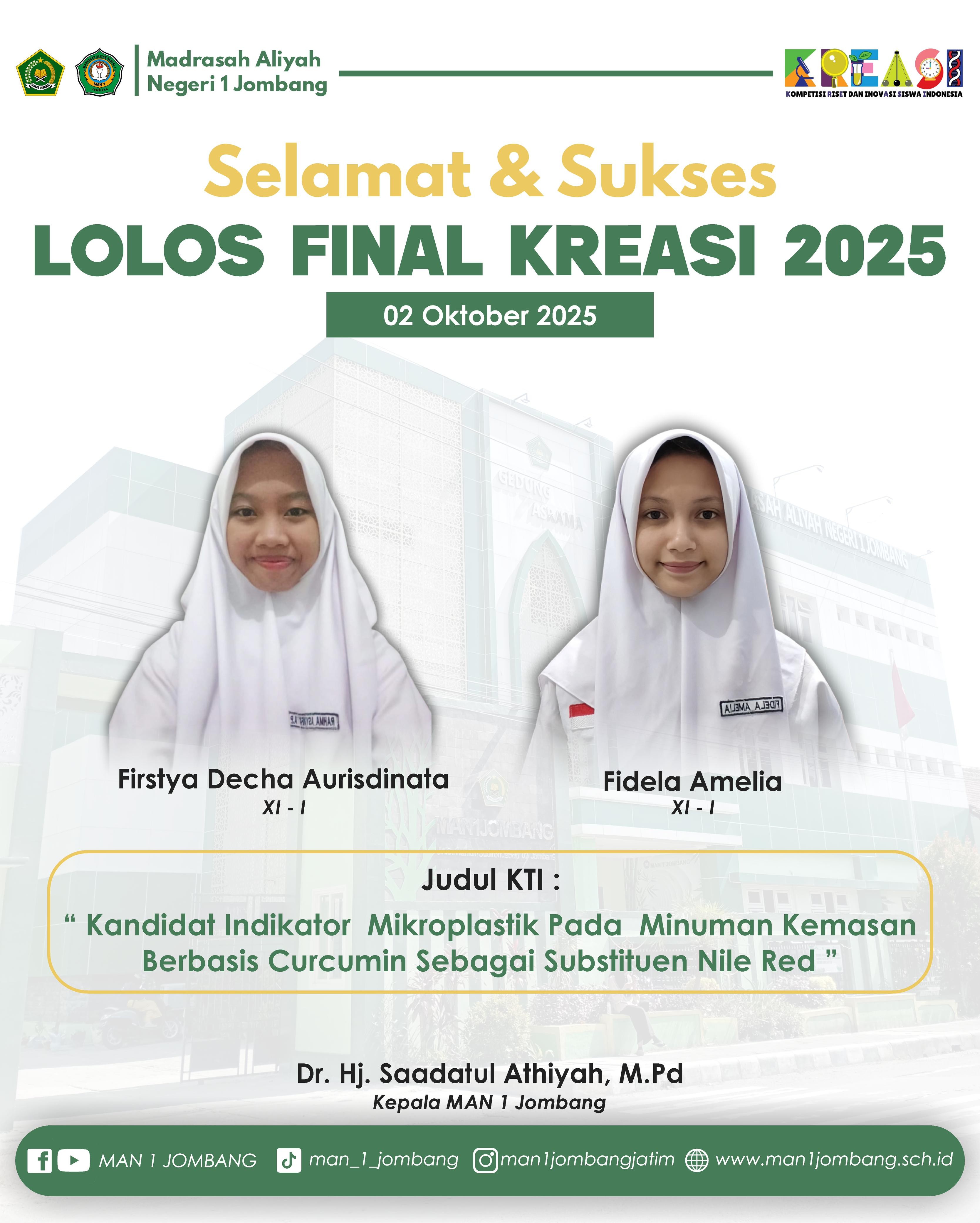 Kepala MAN 1 Jombang, Hj. Saadatul Athiyah, M.Pd., mengungkapkan rasa bangganya atas prestasi yang diraih oleh siswa-siswi sekolahnya. Menurutnya, pencapaian ini menjadi bukti bahwa pendidikan di MAN 1 Jombang tidak hanya berfokus pada aspek akademik, tetapi juga pada pengembangan kreativitas dan keterampilan siswa. “Kami sangat bangga dengan prestasi ini. Film ini bukan hanya menunjukkan kemampuan teknis siswa dalam membuat karya seni, tetapi juga mengajarkan nilai-nilai penting tentang kewirausahaan dan kepedulian terhadap lingkungan,” ujar Beliau.